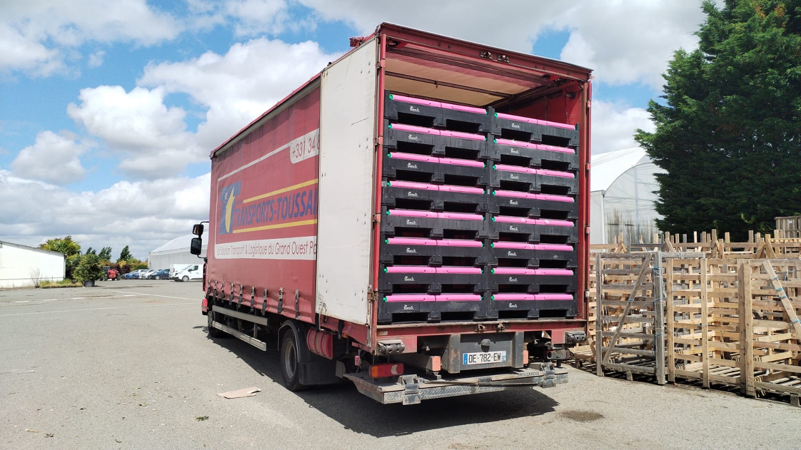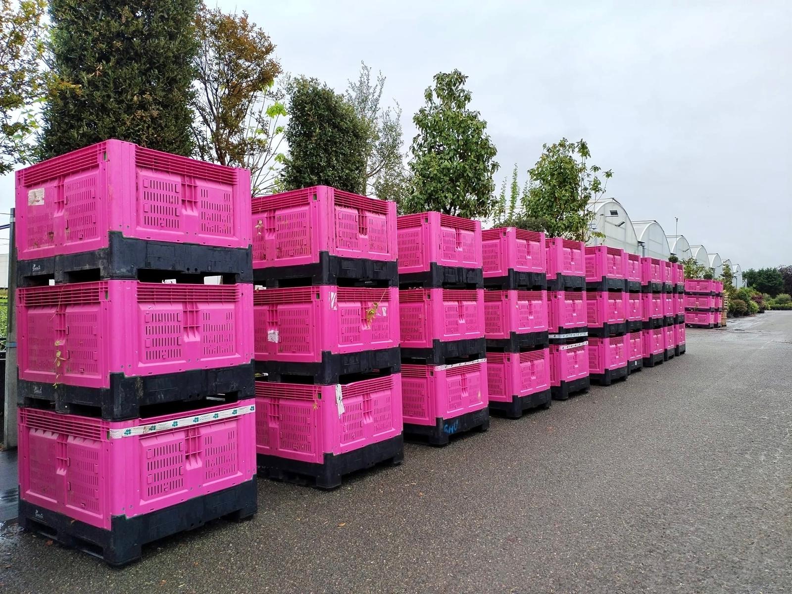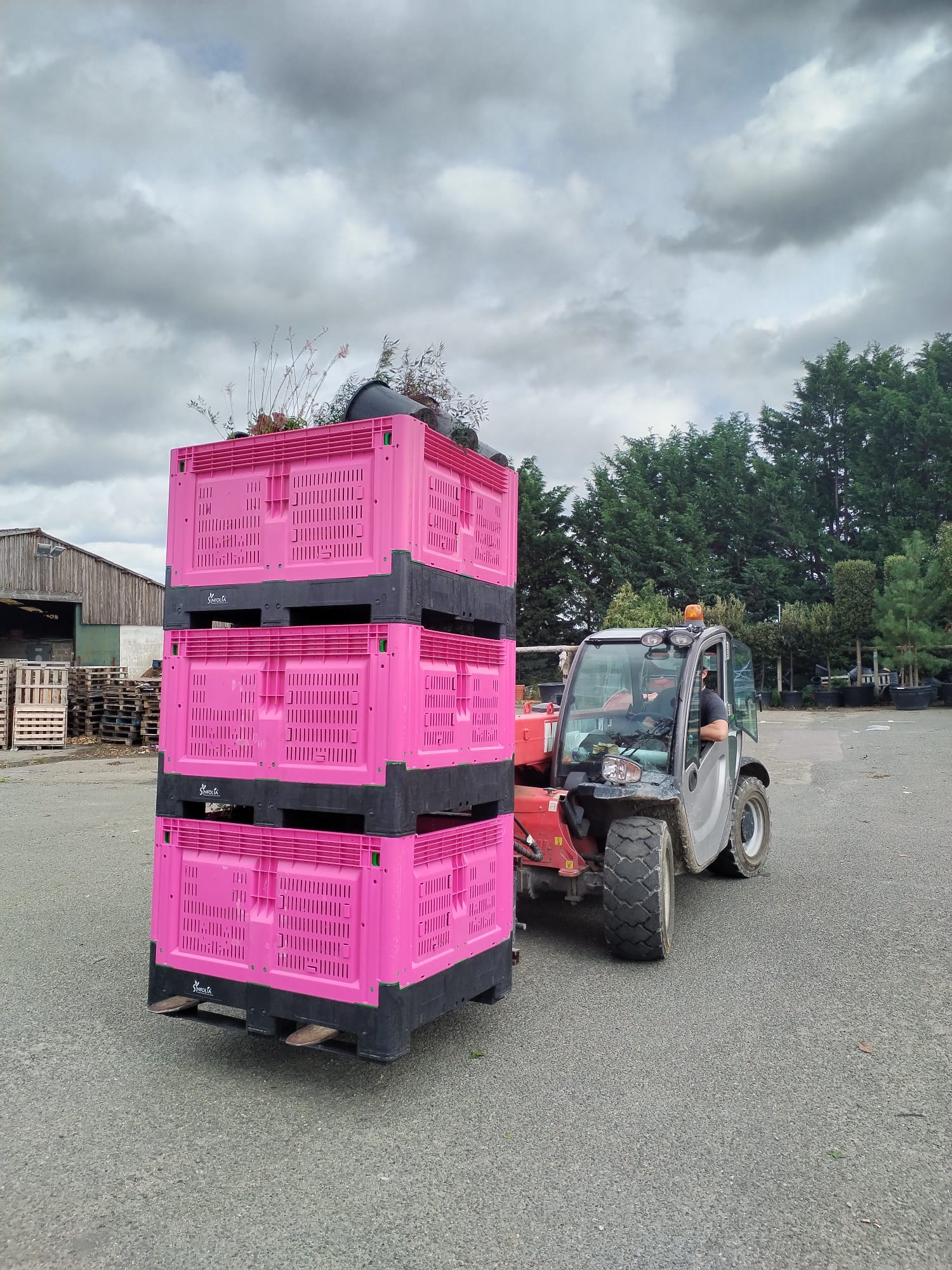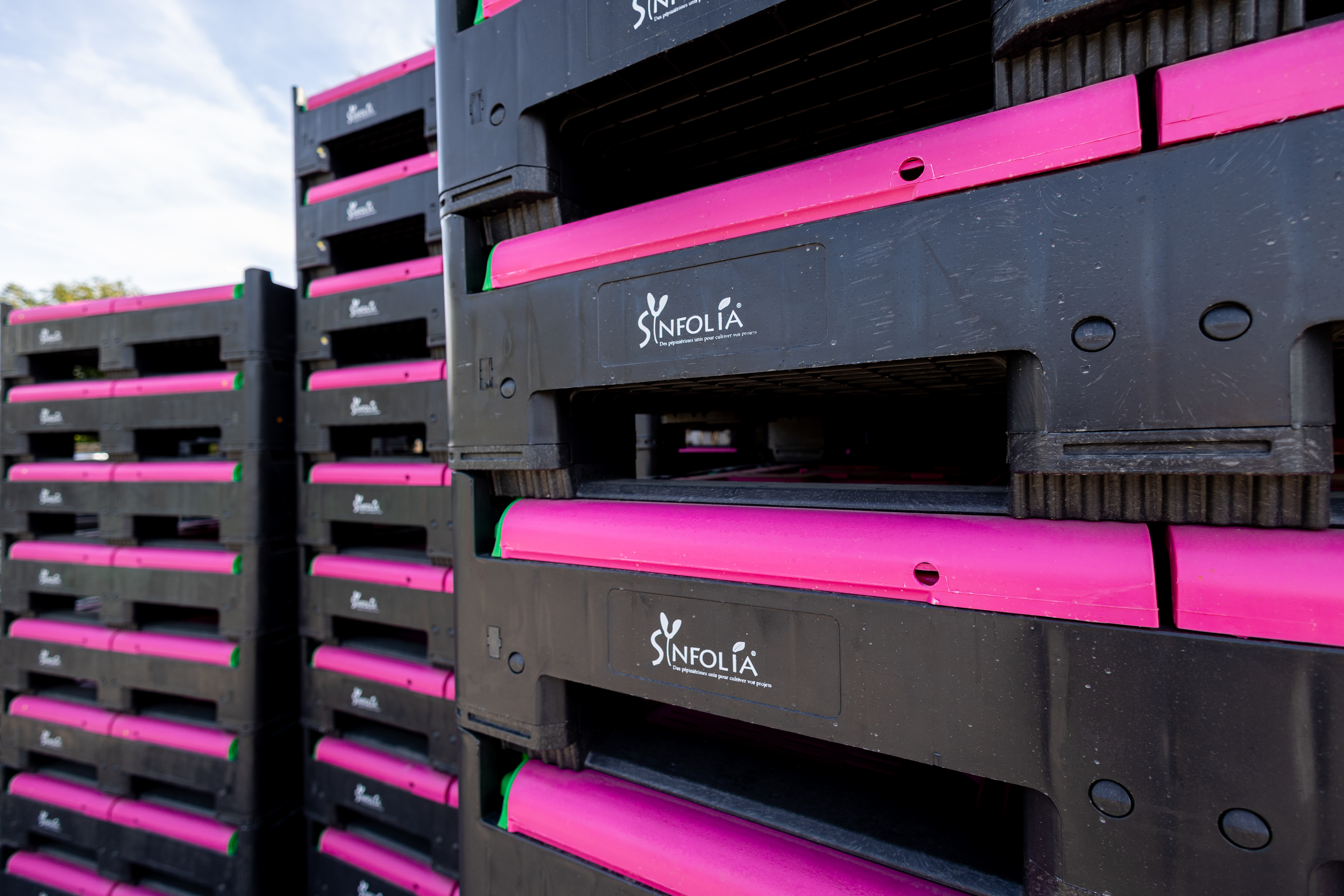 Depuis plus d'un an, nous avons intégré ces palettes aux couleurs vives de Synfolia, des box roses réutilisables et pliables, véritables alliées pour une gestion plus efficace de la manutention, du stockage et du transport.
